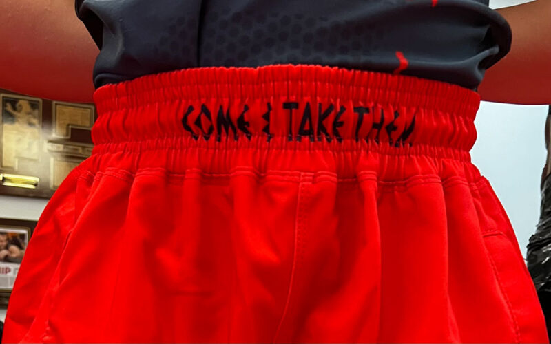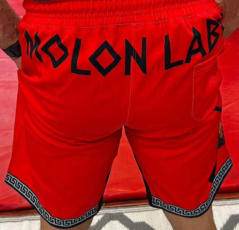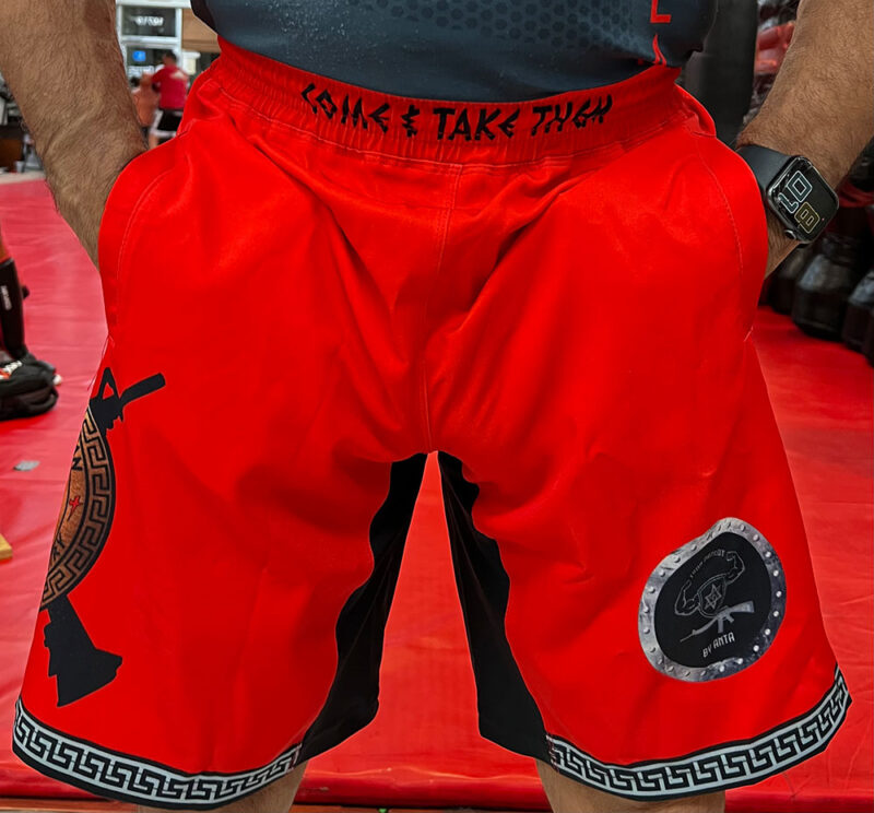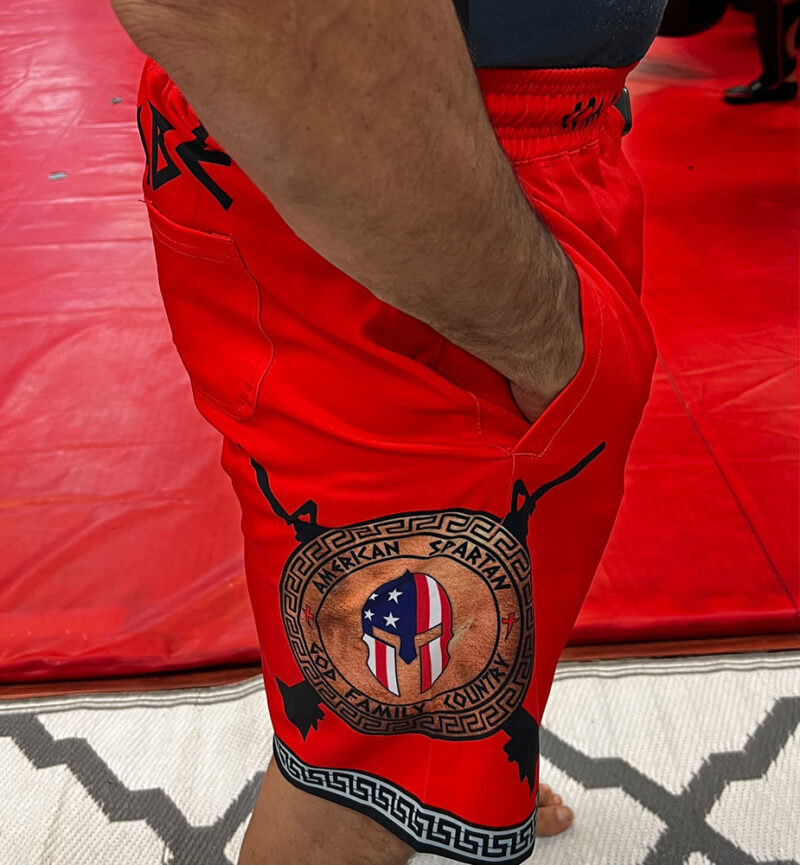 Red shorts, with elastic waistband, 3 pockets. They have an American Spartan logo on the right under the pocket. The red represents the Spartans Cape. On the front of the left is the Iron Patriot by Anta logo. On the waist band Come & Take Them. On the back of the shorts Molon Labe. On the bottom of the shorts is the Greek pattern meander.